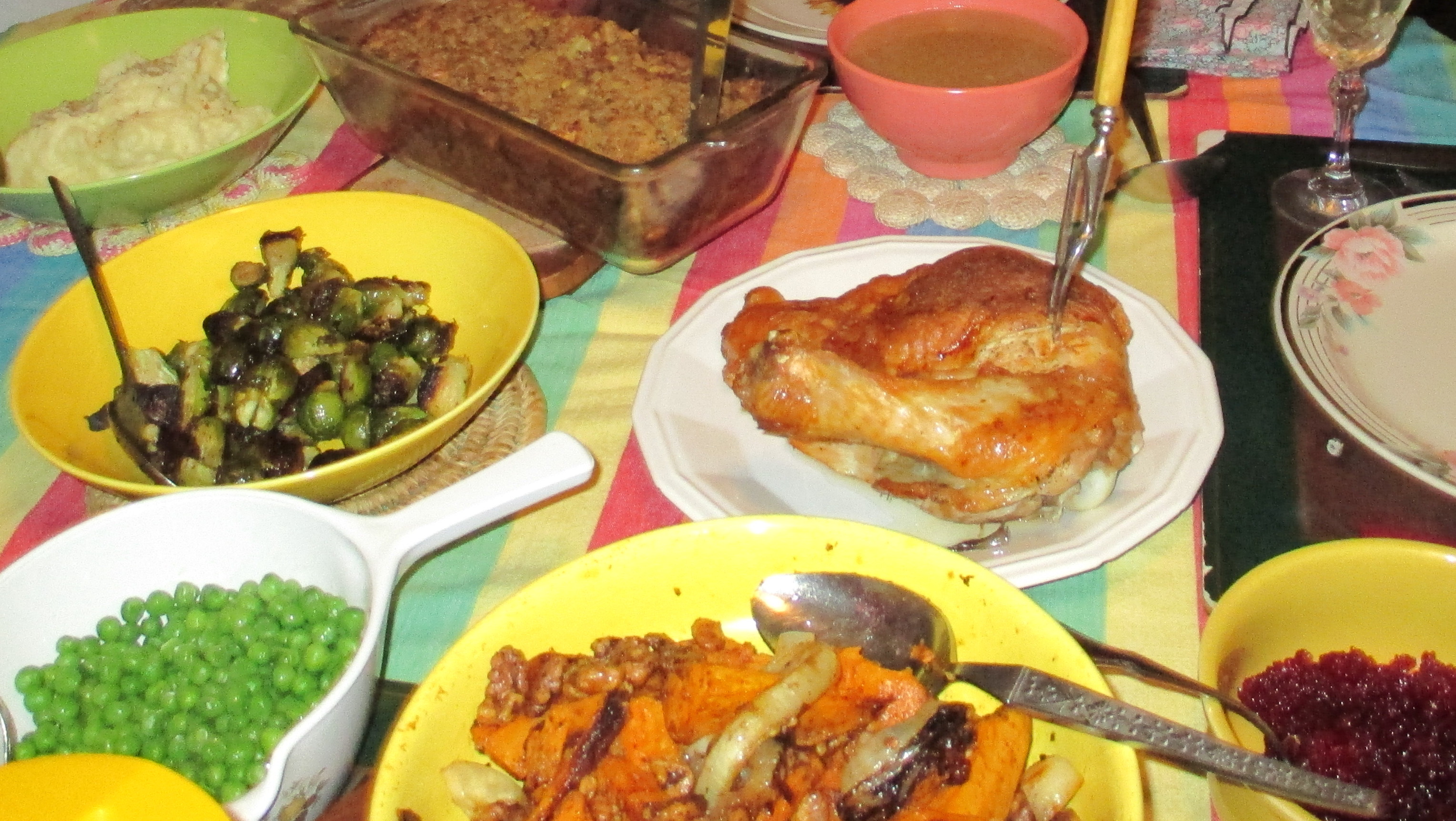 The result? Lousy photos but delicious herb-roasted turkey breast half, Yukon Gold mashed potatoes, bacon and cornbread dressing with pine nuts, brussel sprouts roasted in olive oil with lemon pepper, spicy roasted yams and onions topped with the nuts made in the morning, green peas with a little butter, Cranberry Lolly, some sparkling apple juice and wine … and a leisurely dinner that was definitely NOT 4500 calories.