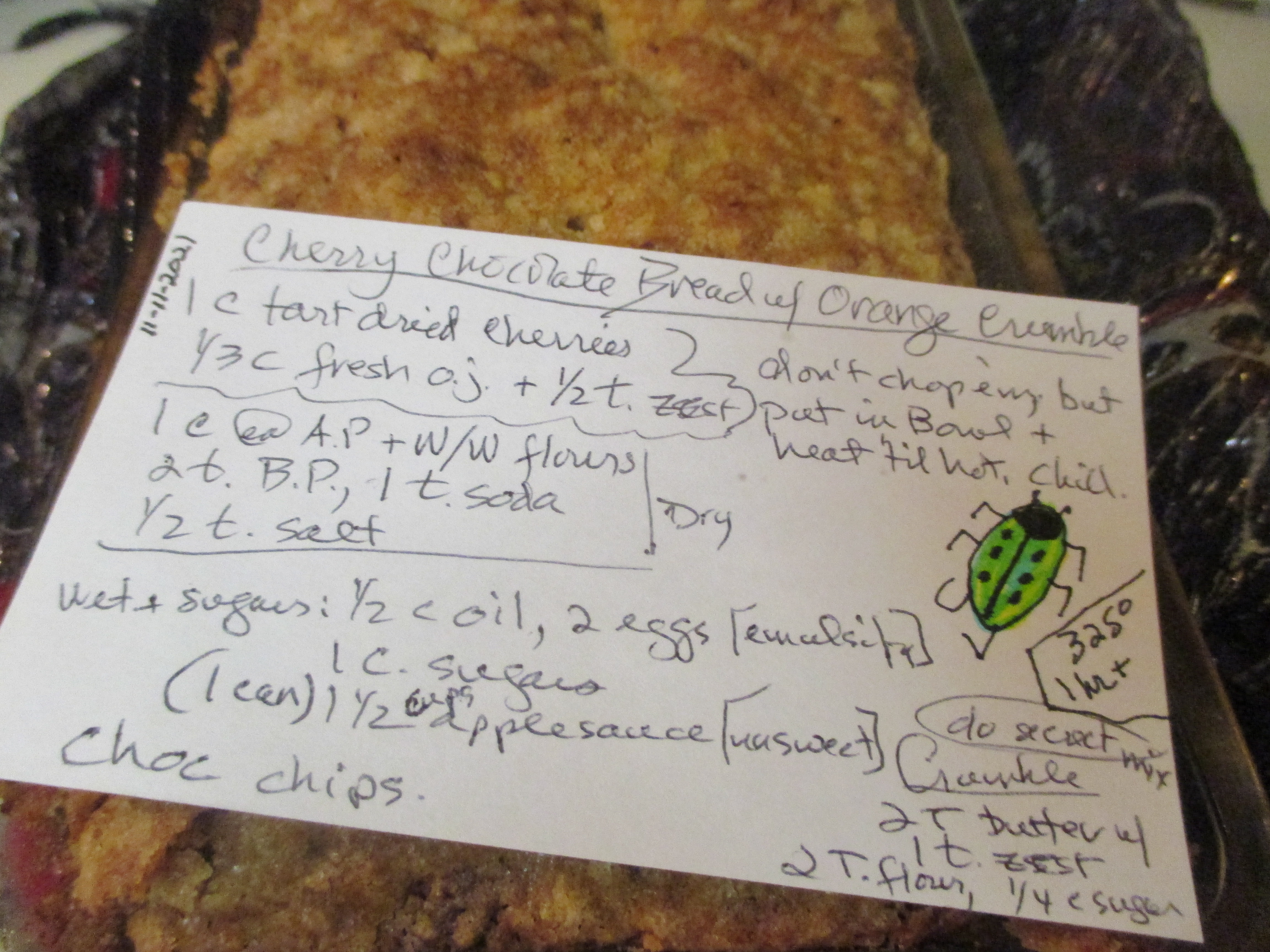 For Veterans’ Day this year, I experimented with flavors in this quick bread, using whole rather than chopped dried tart cherries, chocolate chips, unsweetened applesauce for a smooth texture and a fresh orange crumble on top.