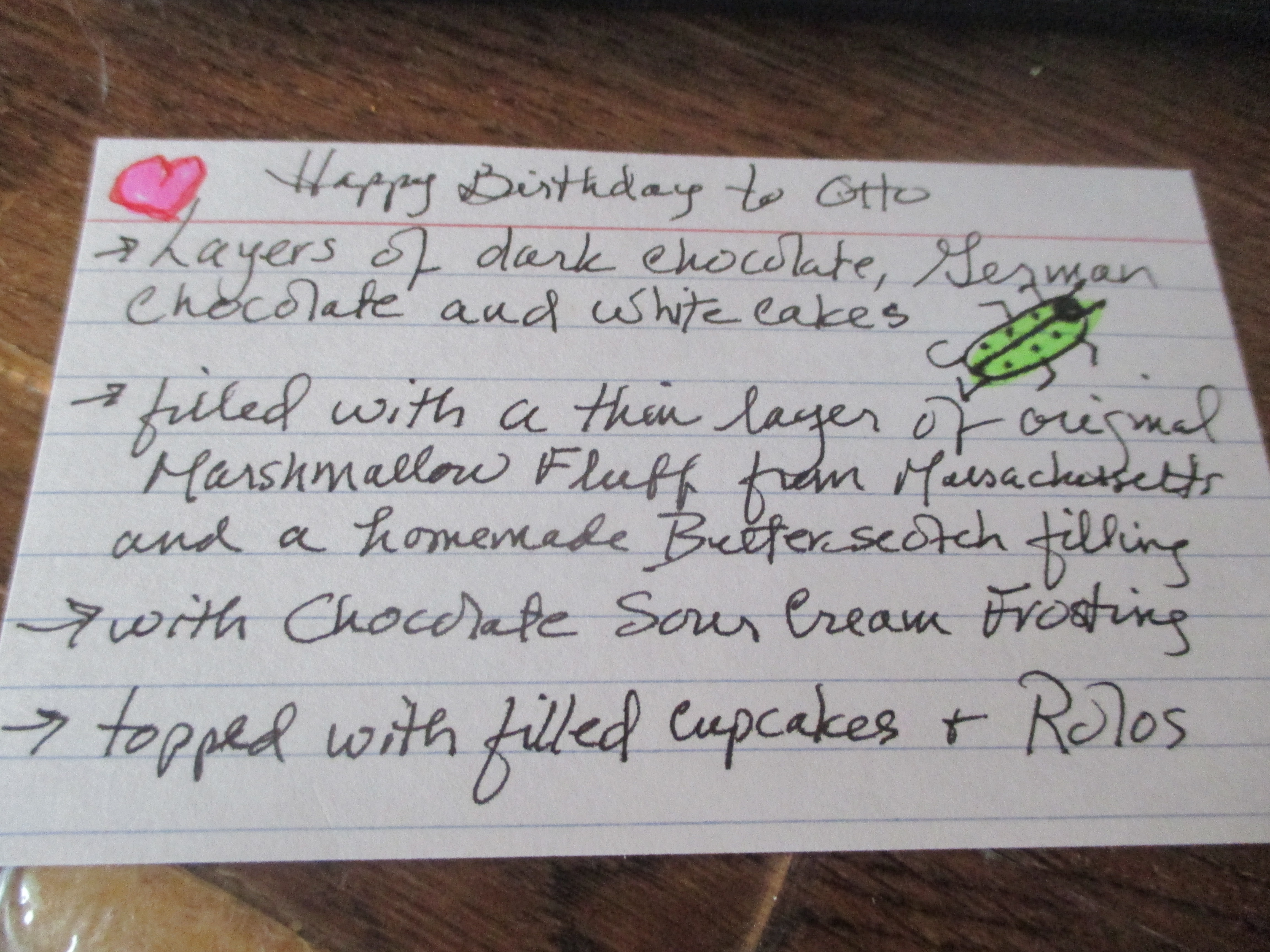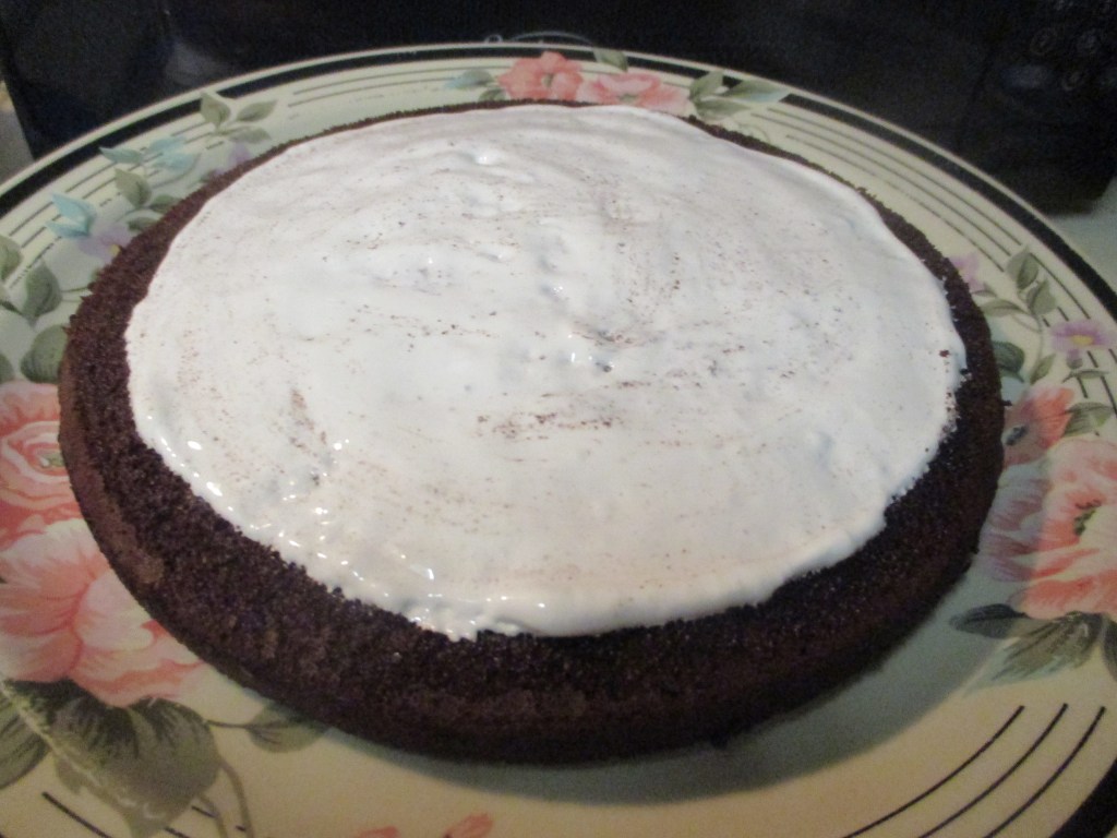 His mother often made his birthday cakes of layers of chocolate and vanilla cakes, as I did a previous year. This year I decided to do something a bit different because my neighbor told me about the use of the original Marshmallow Fluff on a slice of bread with peanut butter and my baking mind said, “put it on cake.” It’s made in a factory in East Lynn, Massachusetts where my lovely neighbor was a child and she said it’s not the same as “ordinary” marshmallow creme. I found it for sale on the behemoth, ordered a jar for her and one for me to use in this cake. There it is on the bottom layer, having given me a hard time in applying it! Rebel Fluff.