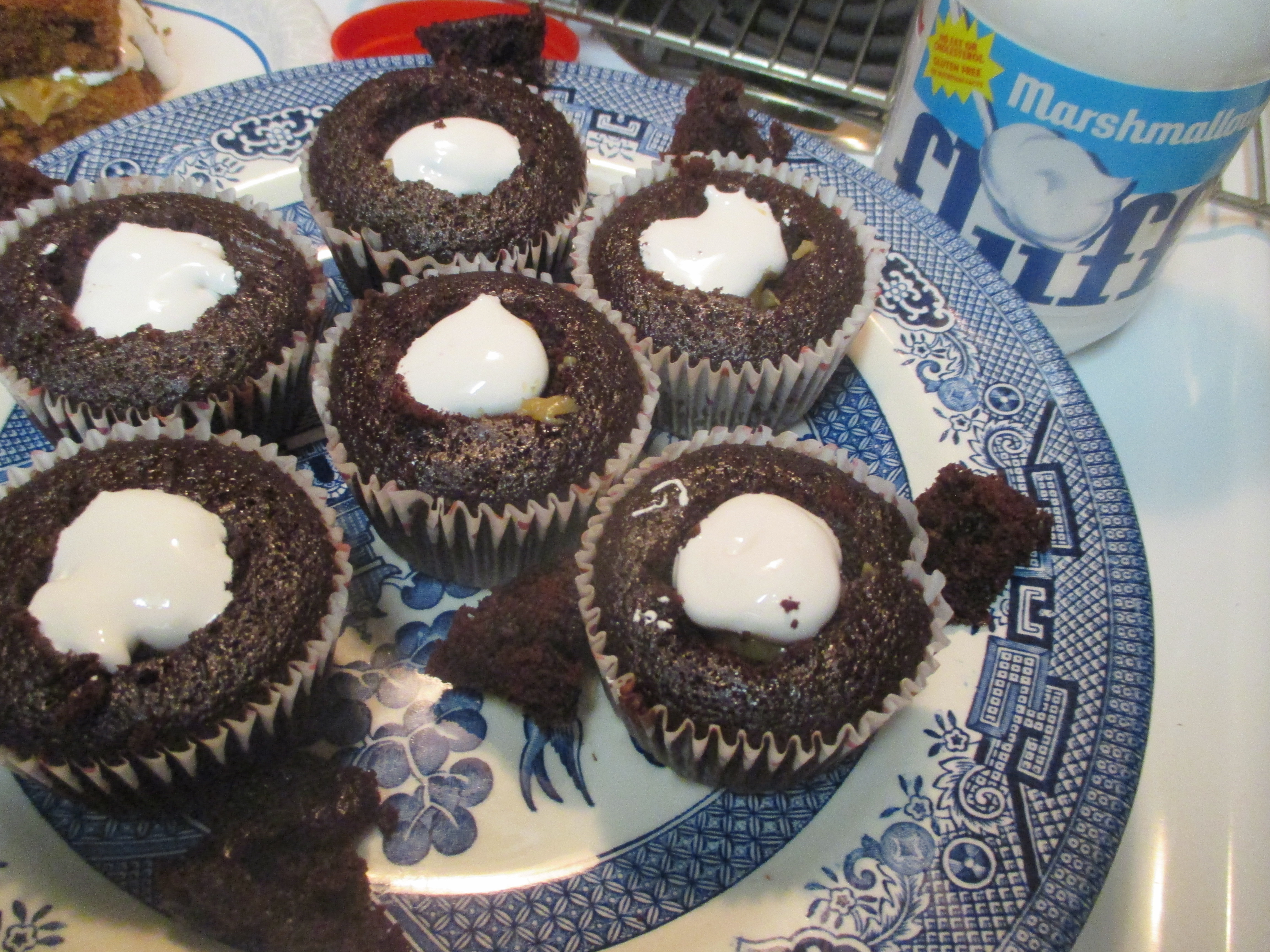 After the Fluff was done arguing with me, I applied a layer of homemade butterscotch filling on top of it, and after that was done, a layer of white cake got the same treatment. The top layer was German chocolate cake, but no goo on it. However, before I completely frosted the cake with Ellensburg Chocolate Cake’s frosting — Sour Cream Chocolate — I prepped six cupcakes with a spoonful of both fillings into a cave made with a melon scooper.