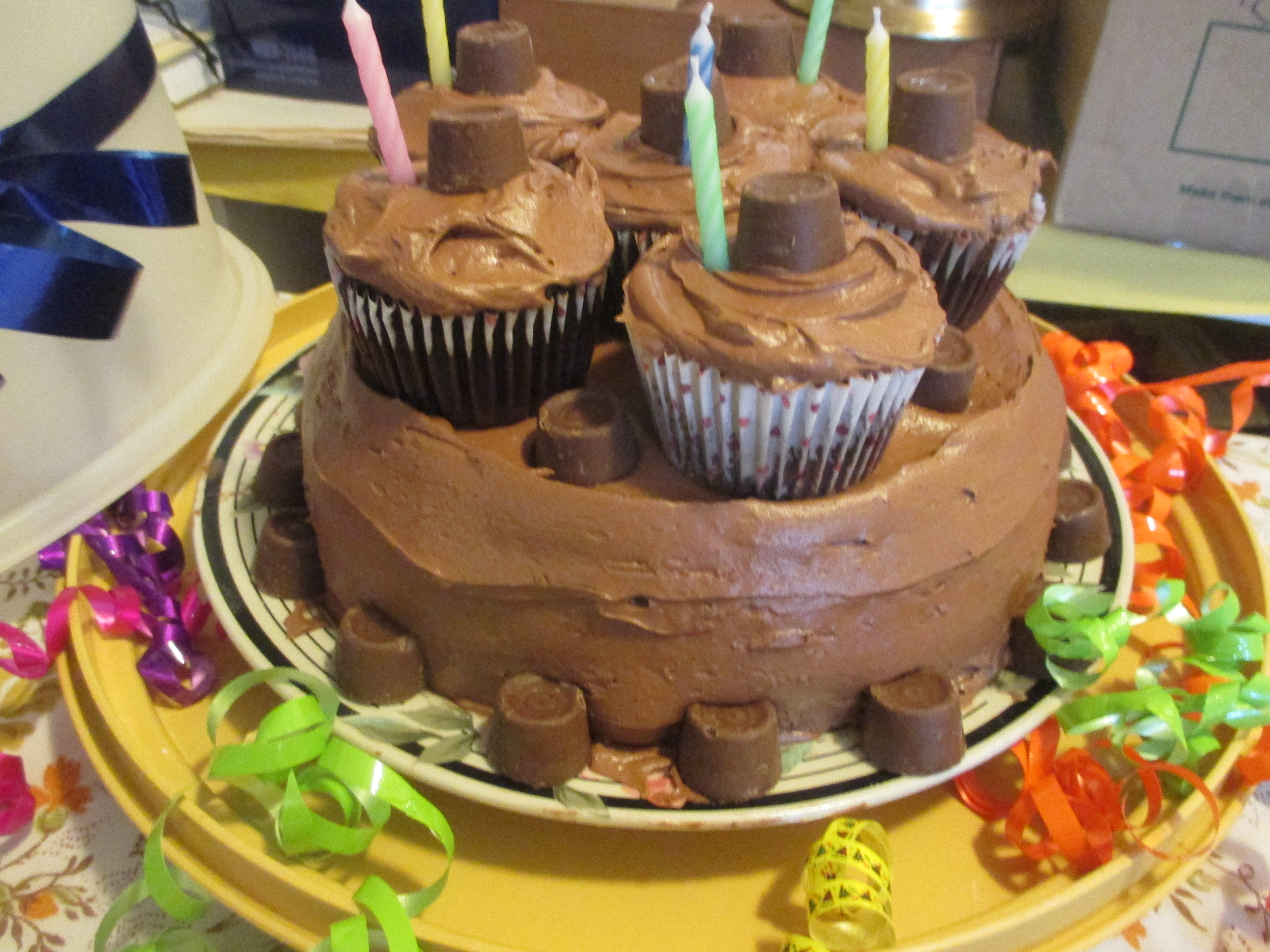 Yep, my plan was to frost the cake and the cupcakes one after the other when the frosting was ready, then put the cupcakes atop the frosted cake and decorate with Rolos and candles.