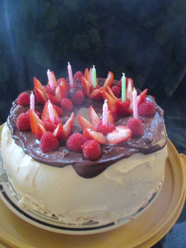 How’s that for a title? The birthday girl requested the Strawberry Well Cake* with berries and cream in the well, but chocolate frosting and definitely without dots like the one below. She said the family was looking at lower sugar than the last cake I made for them, but she hadn’t realized that angel food cake is perhaps the sweetest of all cakes being made of just sugar, egg whites and enough flour and leavening to hold it together.