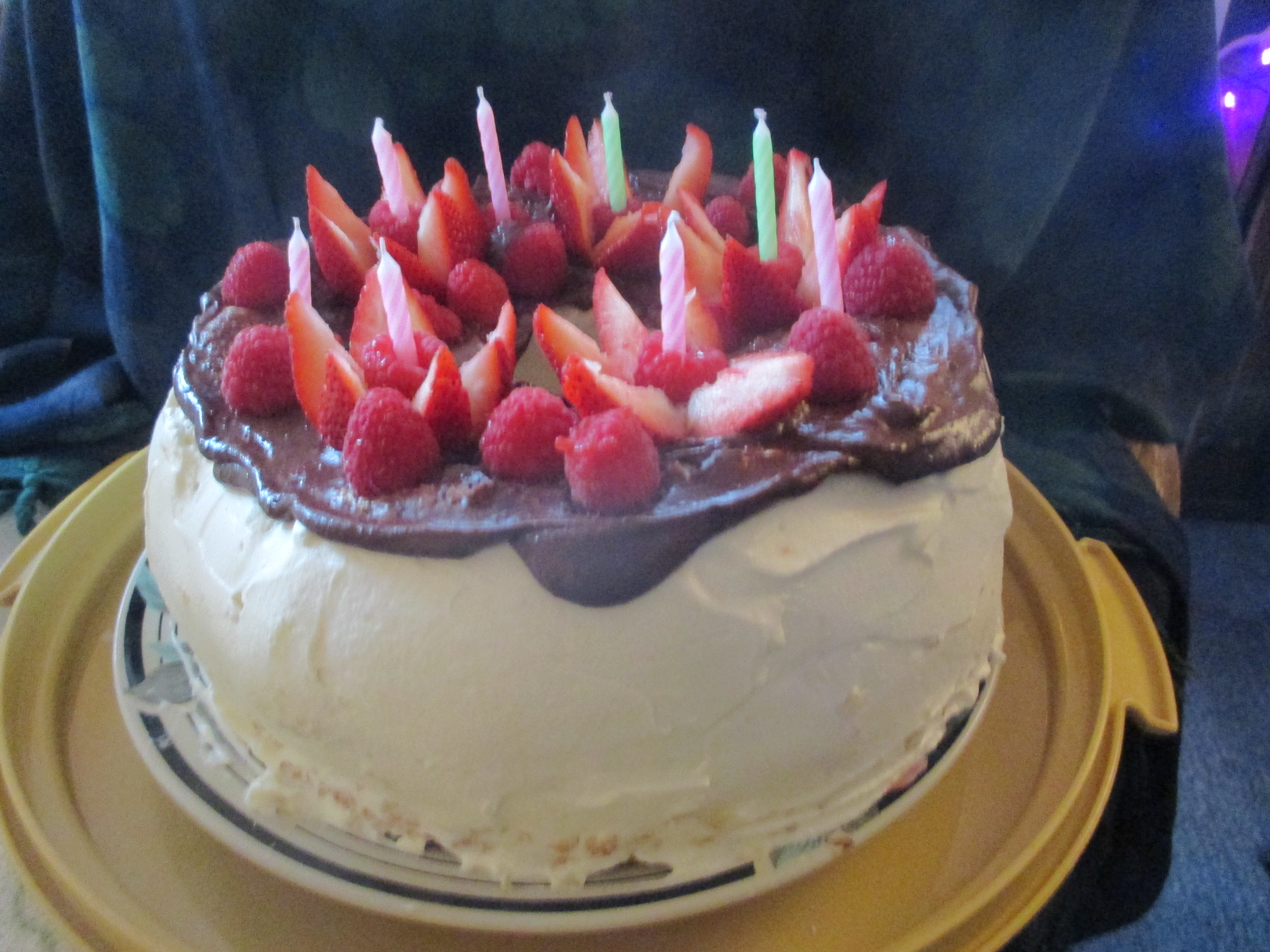 How’s that for a title? The birthday girl requested the Strawberry Well Cake* with berries and cream in the well, but chocolate frosting and definitely without dots like the one below. She said the family was looking at lower sugar than the last cake I made for them, but she hadn’t realized that angel food cake is perhaps the sweetest of all cakes being made of just sugar, egg whites and enough flour and leavening to hold it together.