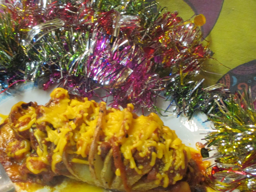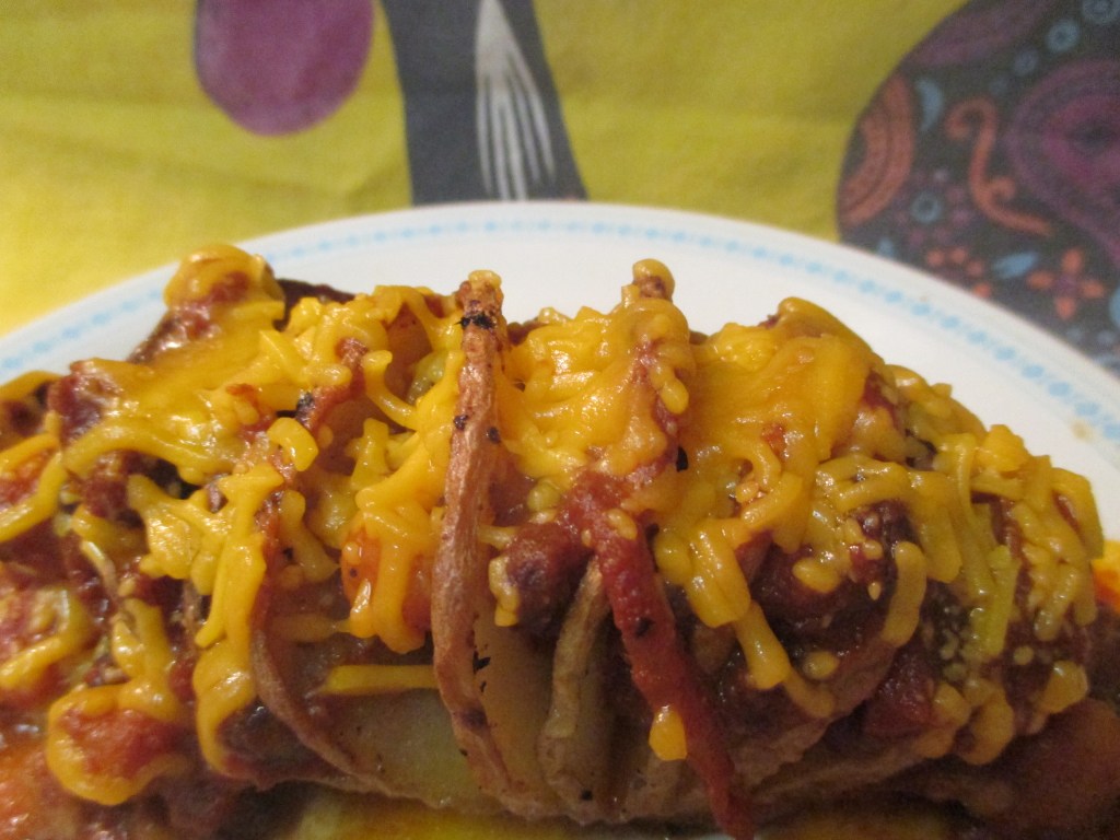 The title says it all, for once, but double up on the Happy New Year. Closeup shows how each slice of the hasselbacked spud has a spoonful of homemade veggie chili and the whole thing is topped with grated sharp cheddar and popped back into the oven to melt.