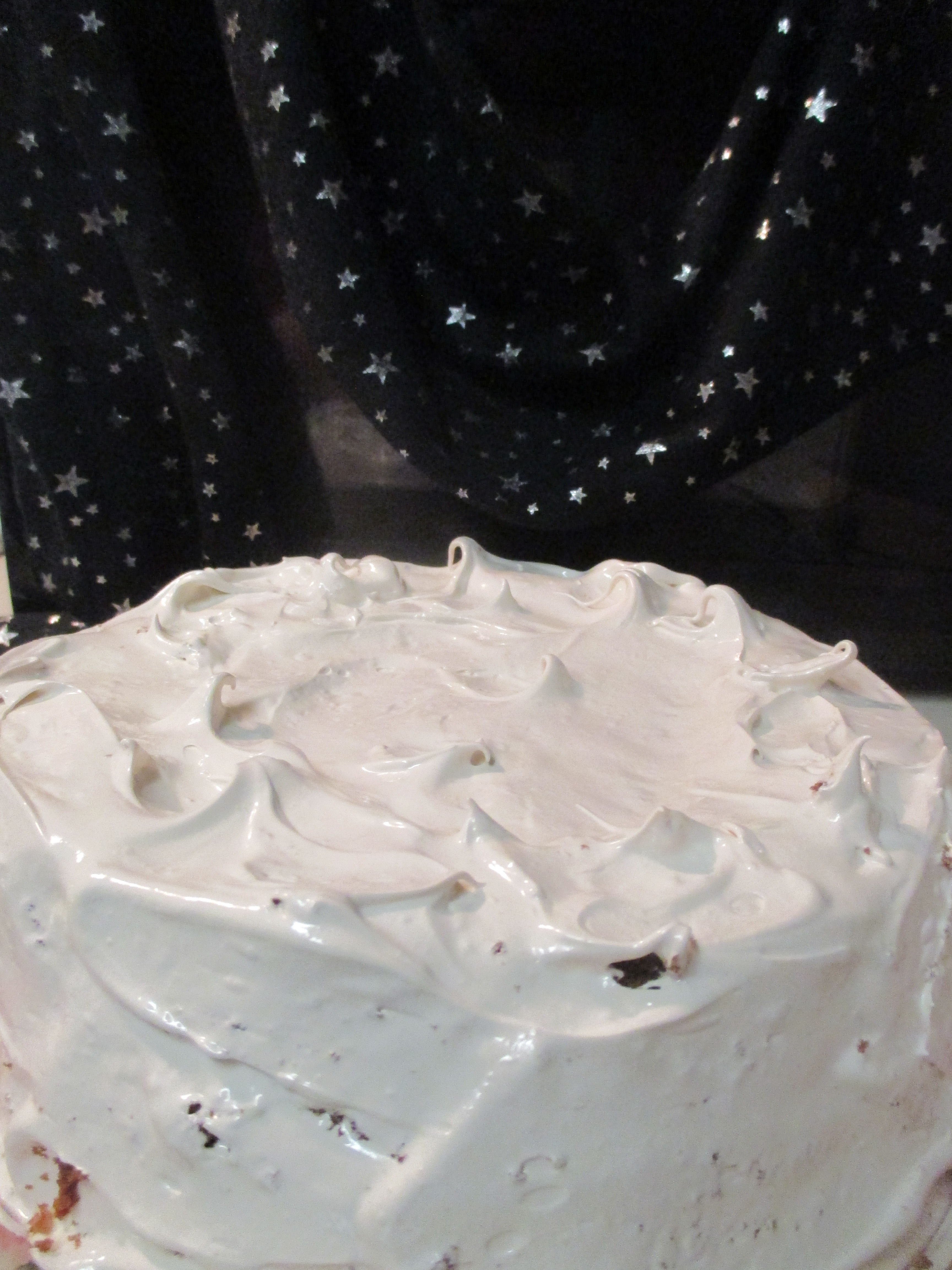 Note: I used the recipe in the 1971 Bantam version of my Betty Crocker All-Time Favorites cookbook. It’s called Satiny Beige Frosting therein, a variation of White Mountain Frosting. The recipe is: stir 1/2 cup brown sugar, 1/4 cup corn syrup, 2 tablespoons water in a small saucepan with a handle; bring to boil on medium heat under a lid (I didn’t use lid because I don’t have one and it boiled before I could cut a piece of foil to fit) then insert candy thermometer and leave it alone to boil vigorously to 242 degrees WITHOUT STIRRING. While it’s boiling like mad, use your stand mixer to whip 2 egg whites to stiff peaks (don’t overmix and take care not to get a single drop of egg yolk in it.) When the syrup reaches 242, turn the mixer on medium speed and pour it in a thin stream (takes a couple minutes) paying attention to your work. Then turn mixer up to high speed and beat until standing peaks form in the frosting when you lift a bit up as you’re scraping the sides while bowl goes around and around. At that point, add 1/2 teaspoon of vanilla, mix it in well. Frost your cake.