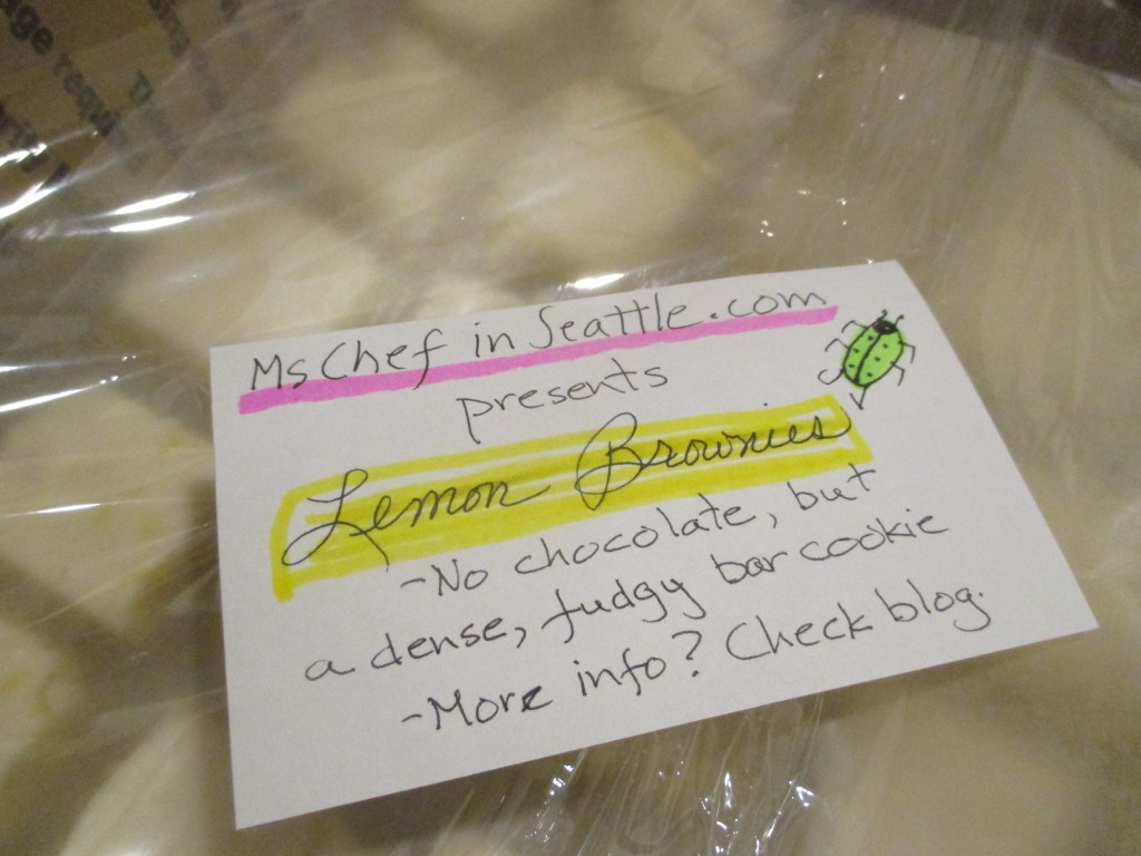 I’ve made the lemon brownies a few times and realized last night that there wasn’t a write-up on the blog and no photo in my Instagram of any but the Orange Jaffa Cake Bars, so this post remedies the overlook. I made them today for my physical therapy team, my drivers and a couple new fans at the storage facility.