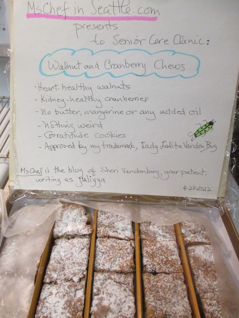 I had an urgent visit to the Harborview Senior Care Clinic a couple of days ago. I was very lucky to be seen next morning rather than making a trip to the emergency room (which I do not like) giving me time to make a quick batch of a favorite cookie. I presented them to the two nurses who looked after me (Naima and Evelyn) and the staff until the doctor knocked on the exam room door. I disagreed on the diagnosis but we’ll see who’s right in a few days. It’s my pleasure to argue with doctors.