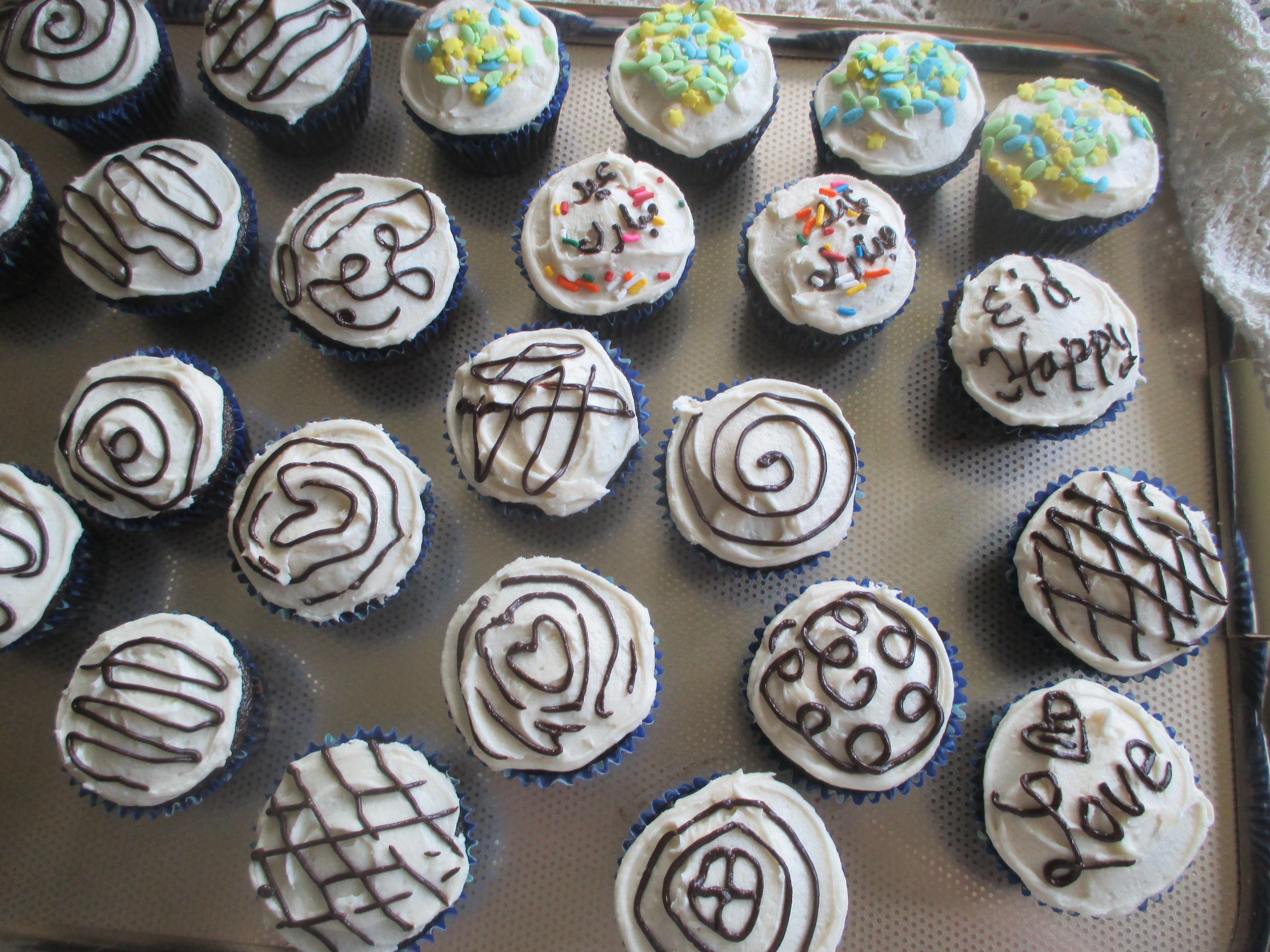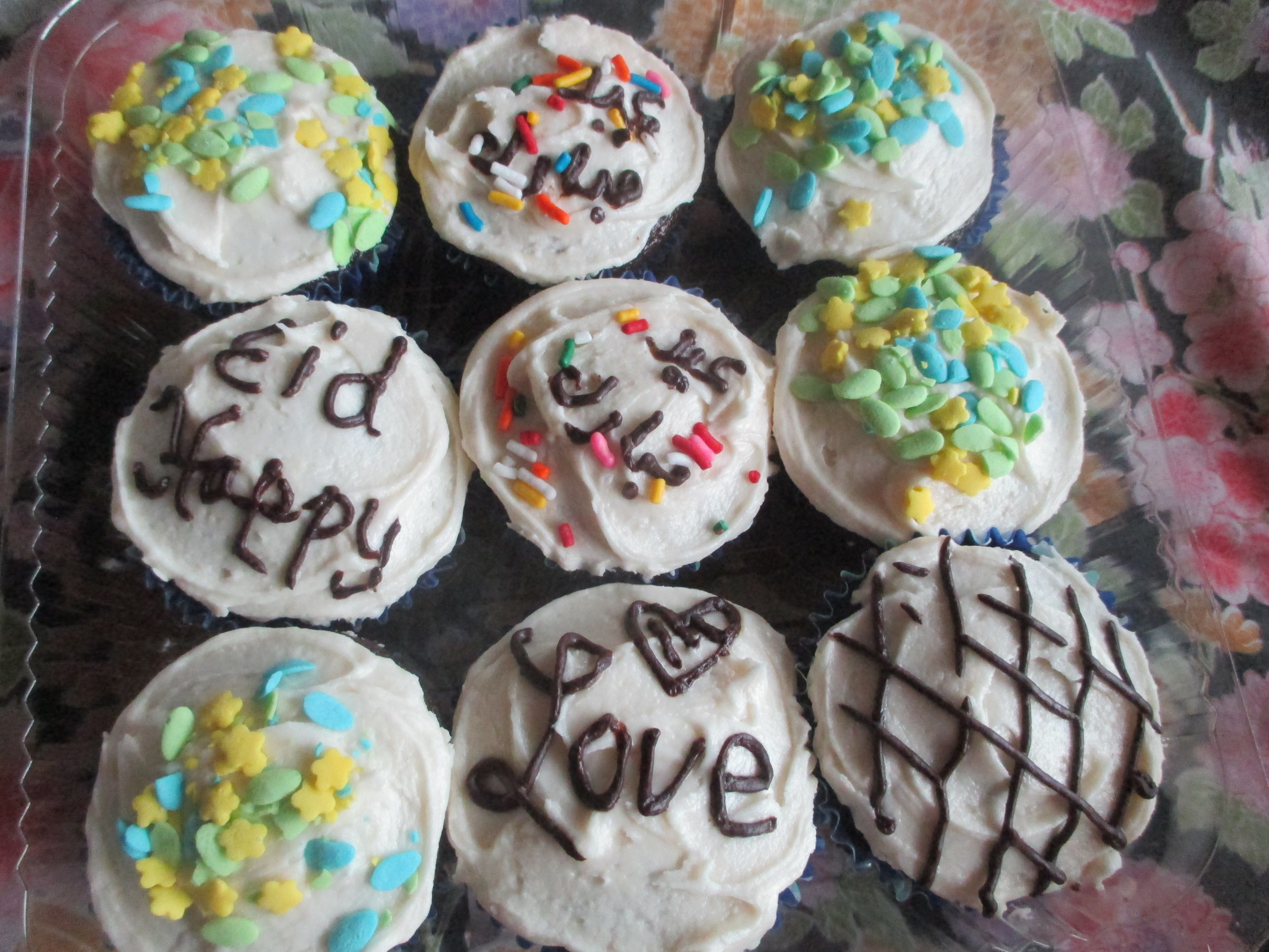 In Seattle, Sunday the first of May is the last full day of Ramadan for the year. That means from sundown Monday until sundown on Tuesday is the holiday known as Eid Al-Fitr, one of the two Eids every year for observing Muslims. It’s a day to wish them Eid Mubarak or Happy Eid. The day is a special one for gift-giving and I like to bake a little something for some friends. This year I chose Crazy Cake cupcakes (chocolate) with Browned Butter Frosting and some sprinkles and/or Jonesing dark chocolate ganache accents. I practice my Arabic writing, too.*