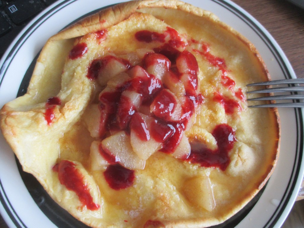 Hah! Another post where the photos will tell most of the story. In the beginning, there was plain brown sugar and butter caramel beneath the simple Dutch Baby batter on a day when I didn’t have syrup and didn’t want lemon/powdered sugar or jam on top. Then I tried it with sliced pear and a sprinkle of cinnamon sugar, then with apple and finally with frozen cranberries. Each one of the variations is delicious. For one person, prepare in the 7″ cast iron frypan and oven at 400 degrees F.
