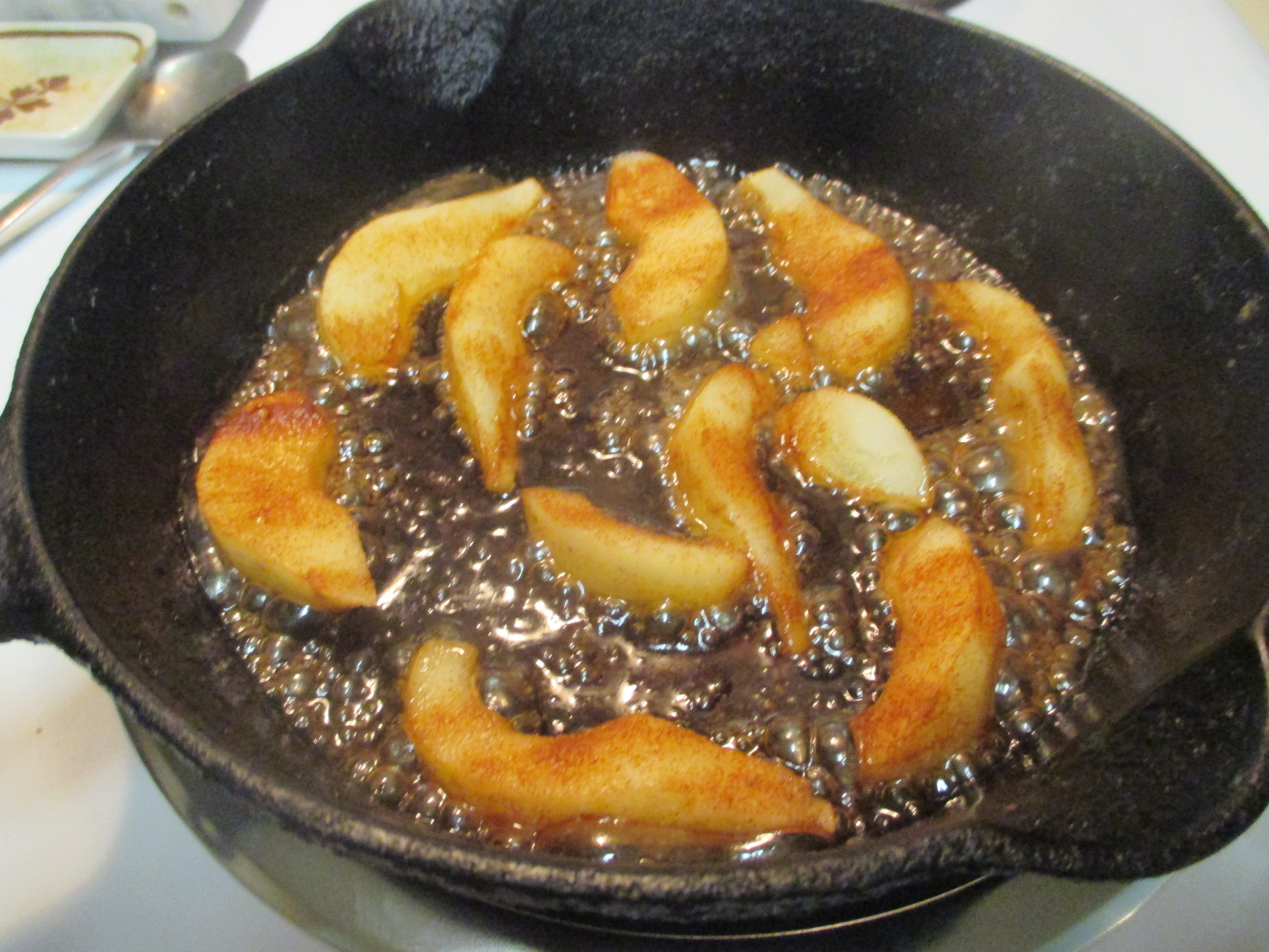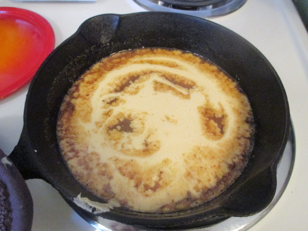 Preheat oven to 400 degrees. Spread a tablespoon or so of soft butter in 7″ cast iron fry pan. Sprinkle with a tablespoon of brown sugar. If adding sliced apple or pear, place slices over the top of the butter/sugar and sprinkle the fruit with a bit of cinnamon sugar. Bake for 15 minutes to caramelize the fruit with the butter/sugar. [If using frozen cranberries: a couple handsful.]