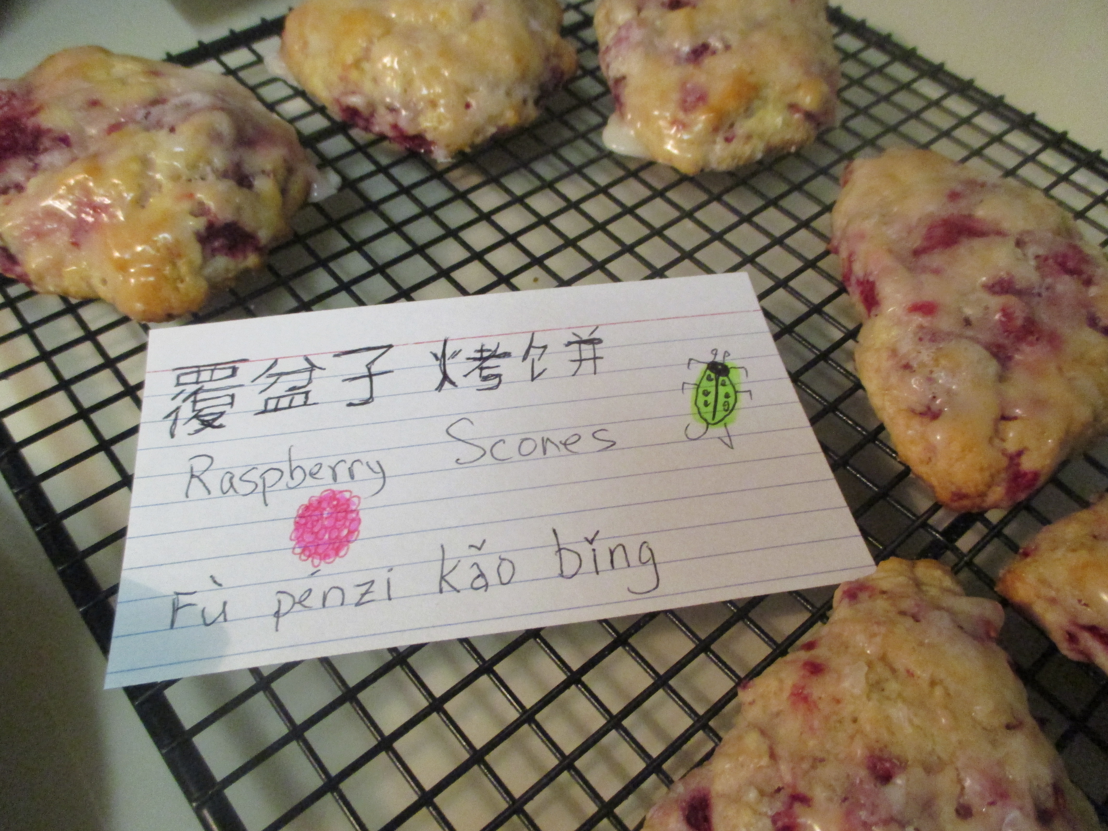 *I had a go at a mini version of my raspberry scone** recipe a week ago for the ladies with whom I play Mahjongg on some Sunday afternoons. As per my new method of copying from Google Translate the Chinese word(s) onto a card to identify the item I’ve baked, the photo: