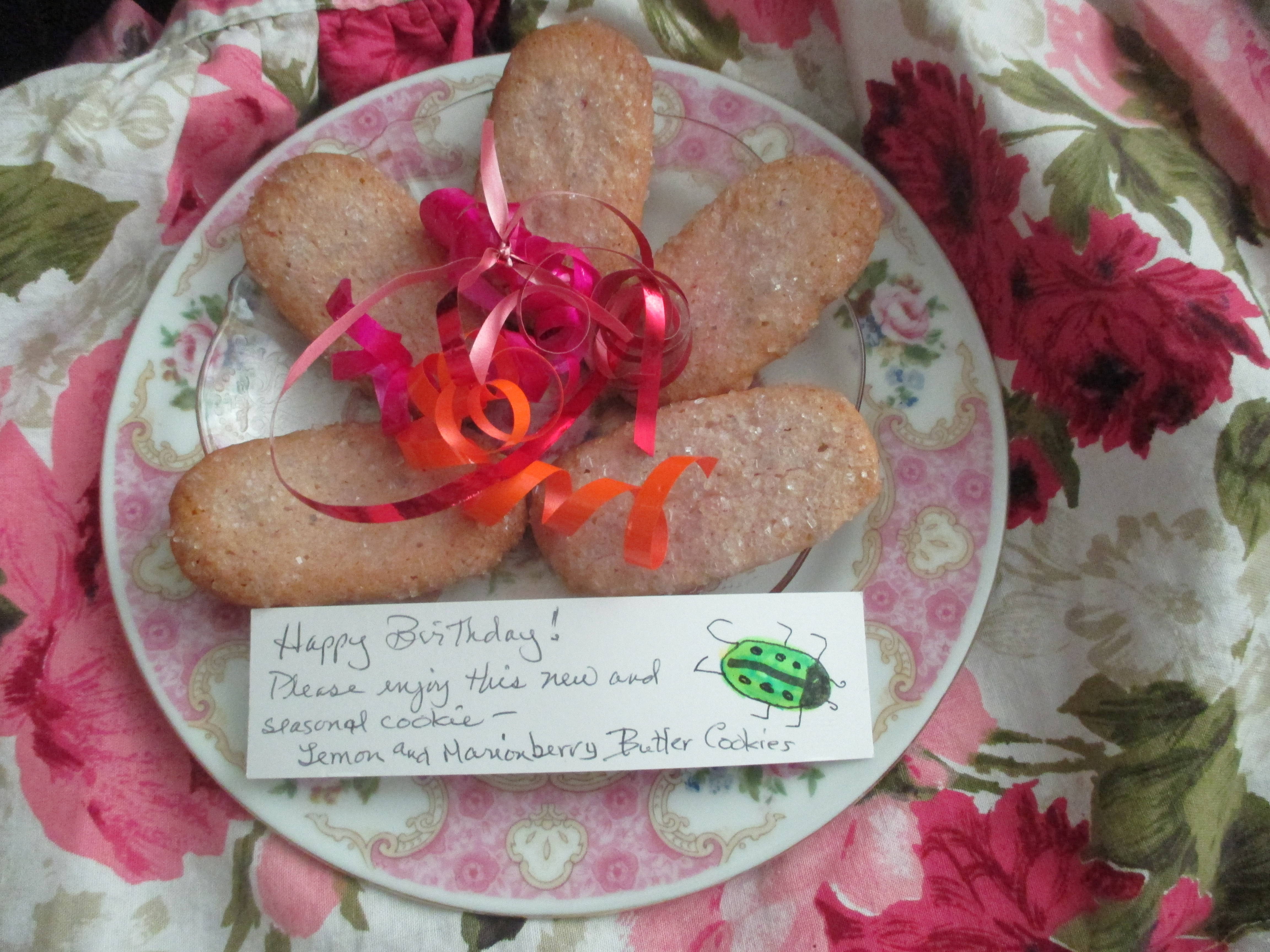 I was given a big handful of organic (i.e., grown in the family garden with no killer fertilizer) marionberries a few days ago while I was house and dogsitting. While I love the flavor of these berries, I do not love their big seeds so I saved them for a little baking project. Today I put them in a small pan with a bit of fresh lemon juice and sugar, brought them to a boil, then smashed the berries and strained all the delicious juice from them. The resulting marionberry sauce was divine, with a couple tablespoonsful on a defrosted mini raspberry scone* and the rest into the new cookie batter.