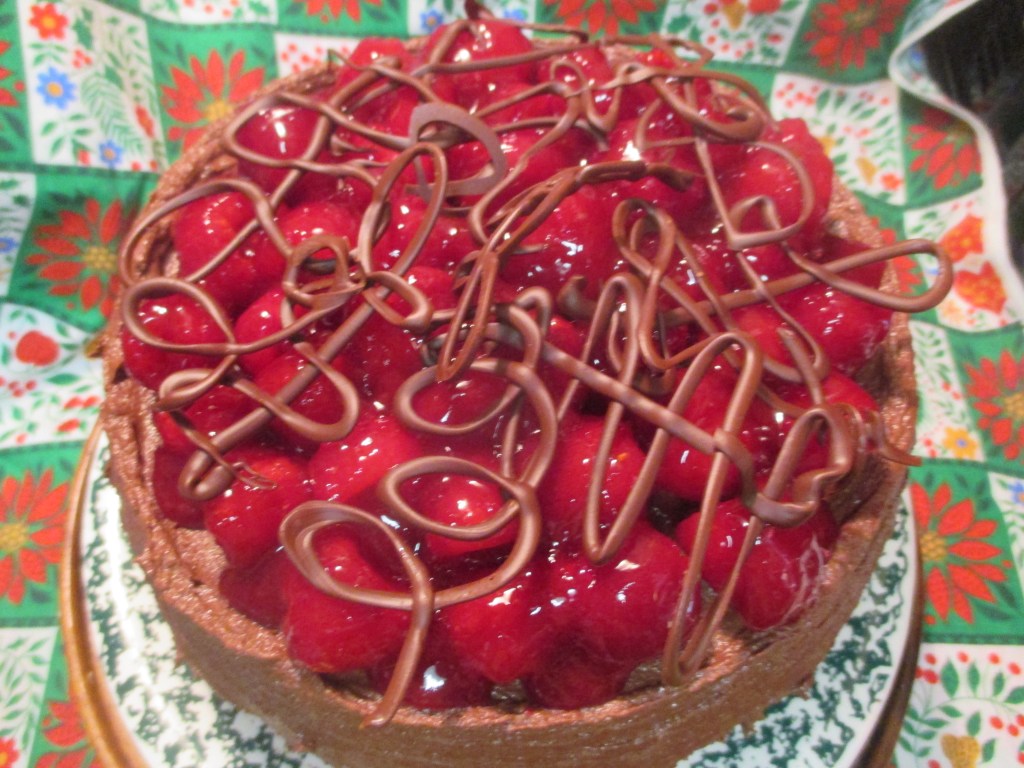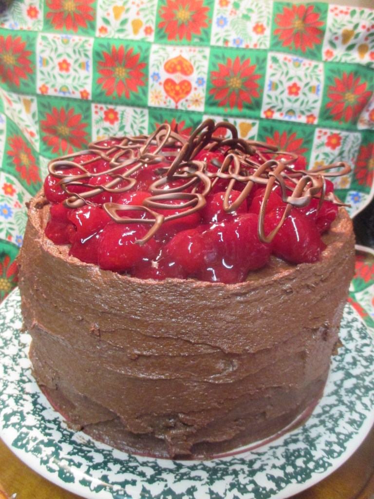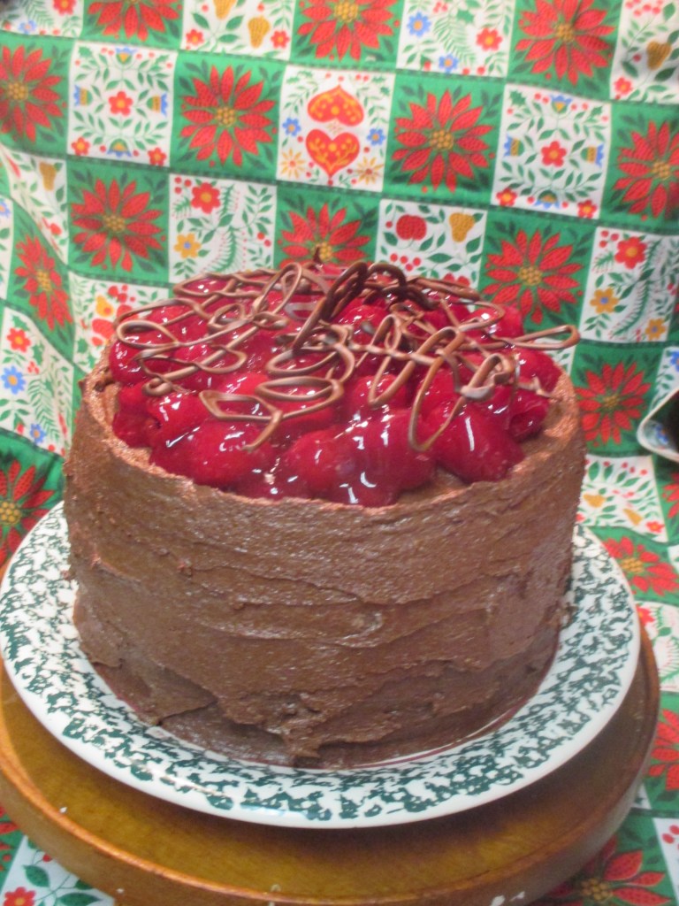 I sort of copied the deluxe chocolate and raspberry cake* I made in October for my jazz pianist friend, but this one is three full 8″ layers and thus very tall. Rather than place the fresh berries on top of the seedless fresh raspberry filling which I’d spooned over each layer of chocolate fudge frosting in the previous cake, I decided to stir the berries for the cake top into the filling. Doesn’t it look scrumptious? Raspberry on raspberry on chocolate.