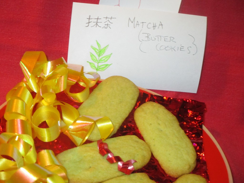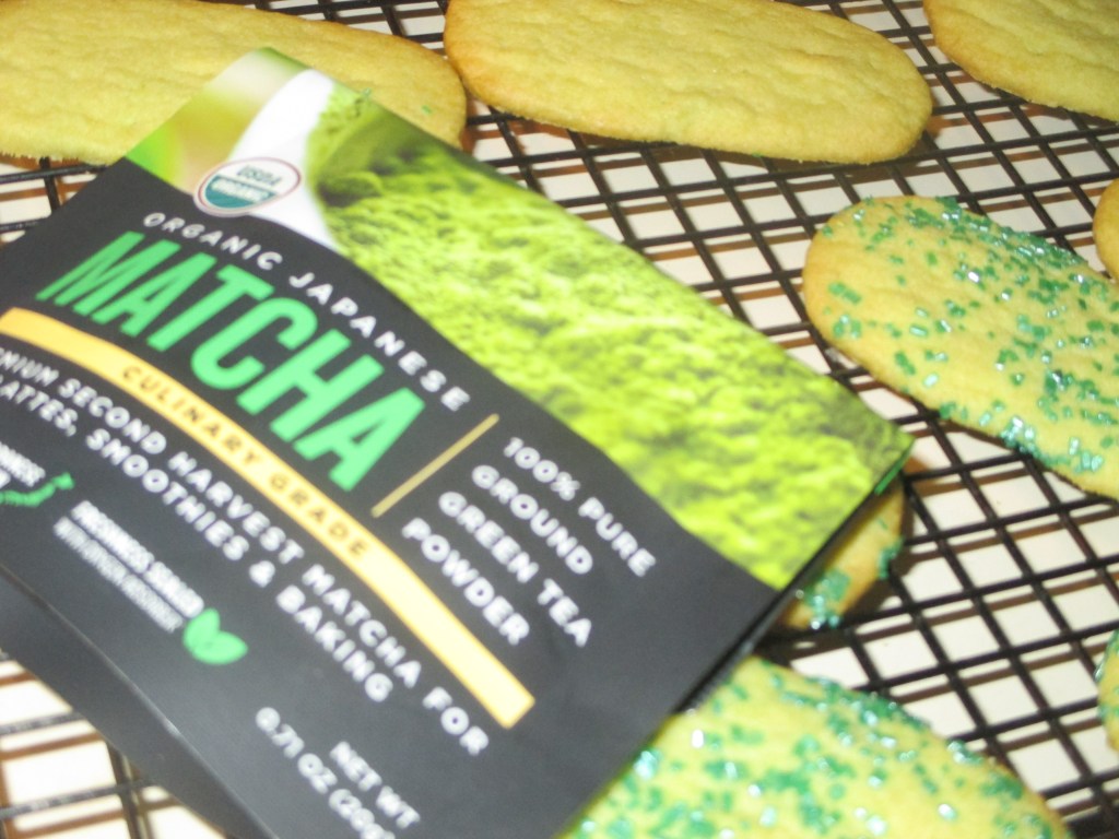 I’ve had an intention to create a trio of cookies using culinary matcha after I discovered a taste for, first, green tea Frappucino at Starbucks and second, Fred Meyer’s Private Selection Matcha Ice Cream. Last week I bought some culinary matcha and on Saturday did the first experimental matcha cookie in two forms, a butter cookie without the customary sparkling sugar for my Chinese friends who prefer less sugar and a few with the sparking sugar for me and others to sample.