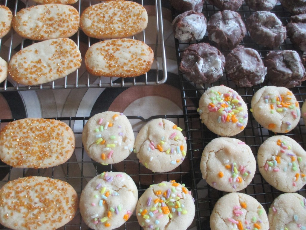 As I said in the previous post, I’m sending birthday surprises to my sweet, sweet sister-in-law who never reads this blog so she won’t see this and the surprise will not be spoiled. These three surprises are all my originals and include Golden Lemon Butter Cookies, the new Lemon Vanilla Spring Sprinkles Snicks and the almost-new Chocolate Silk Toffee Chews. I’m also making some Peanut Butter Graham Sandwich cookies in a little while to add to the mix. Remember those from childhood, all you oldies? Peanut butter frosting sandwiched in between a couple graham crackers, left to “mellow” for a day or so. My stepbrother is fond of peanut butter and dark chocolate, so I send a couple types he favors.