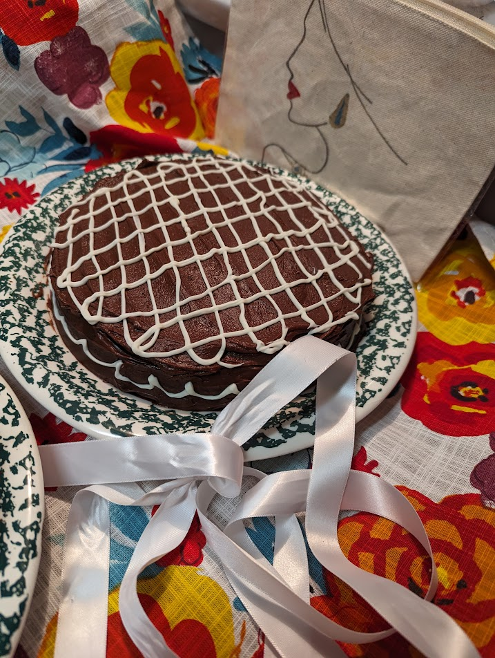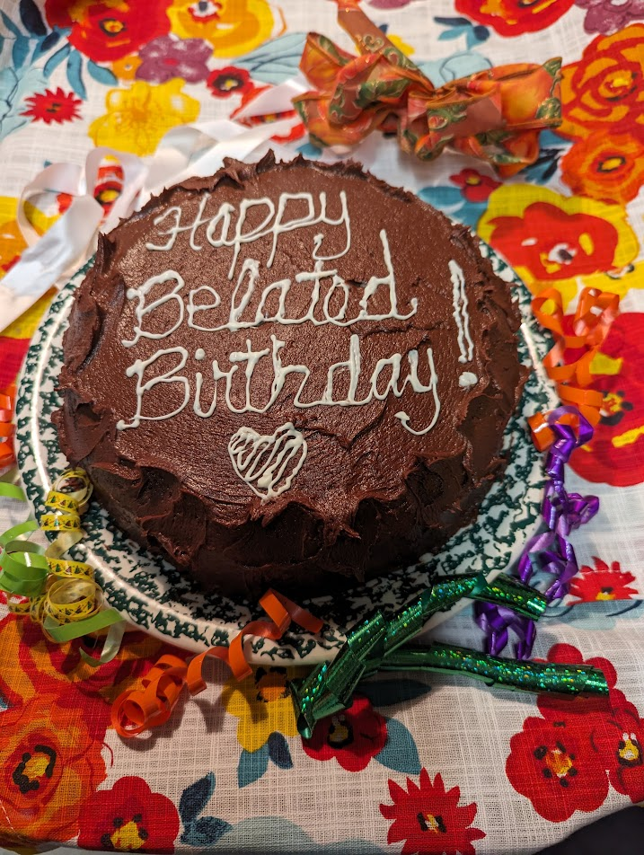As I wrote on my Instagram: My friend Dom’s birthday was on the 4th. I missed it but said I’d make him a cake for the next time I see him. What kind would he like? Chocolate. What kind of frosting? Chocolate. So tonight I made his Belated cake and a Spare because I’ll see him in the morning. He doesn’t know about the cake, but the event we are to attend suggests food is welcomed. That’s why I made two cakes. What if he doesn’t want to share his cake with this particular group but with other friends? Well, there’s a Spare, right?
