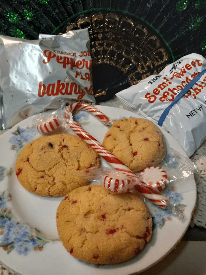I went into my local Trader Joe’s last week on the hunt for some more of their yummy Sea Salt Caramel Chips but, as with other favored products you’ll find on their shelves, the item is either discontinued or seasonal and those chips are seasonal. That’s a serious marketing problem, in my opinion, because caramel is definitely not seasonal while it could be argued that peppermint is seasonal. I’d read in an article that certain items would not be available after the holidays and one of them is the peppermint-flavored baking chips, which I’d never tried. I saw a stack of them on a shelf and grabbed one, thinking about the possibilities in a cookie.