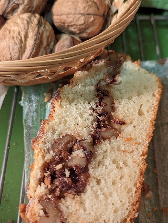A neighbor grew up with a version of this cinnamon and walnut bread with Red Hots, but a piece she gave me to taste was very dry and I decided to have a go using my own base recipe for quick breads. I added a whole 5.5 ounce package of Red Hots, which was too many for my taste. However, my daughter loved that it’s tasty, chewy and crunchy when toasted. Neighbor’s recipe has only 1/3 cup Red Hots, more reasonable. It’s lovely and moist, not over dense.