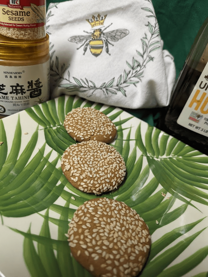 I looked for recipes which included the words “Chinese tahini” and “sesame seeds” and I found one which offers several options. None have butter or egg. This one has the expensive Chinese tahini, raw unfiltered honey instead of sugar, toasted sesame in the cookies and flattened in more toasted sesame (which makes them pretty, right?) It has both almond and all-purpose flours. It can be made gluten-free using only almond flour, and made vegan by substituting maple syrup for the honey. I’m going to do the GF next because I love the taste and texture of GF cookies made with almond flour but I’ll keep the honey because my palate loves it.
