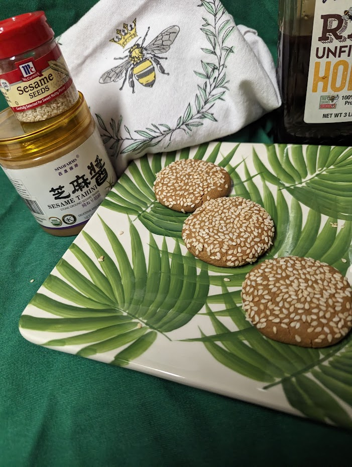 I looked for recipes which included the words “Chinese tahini” and “sesame seeds” and I found one which offers several options. None have butter or egg. This one has the expensive Chinese tahini, raw unfiltered honey instead of sugar, toasted sesame in the cookies and flattened in more toasted sesame (which makes them pretty, right?) It has both almond and all-purpose flours. It can be made gluten-free using only almond flour, and made vegan by substituting maple syrup for the honey. I’m going to do the GF next because I love the taste and texture of GF cookies made with almond flour but I’ll keep the honey because my palate loves it.