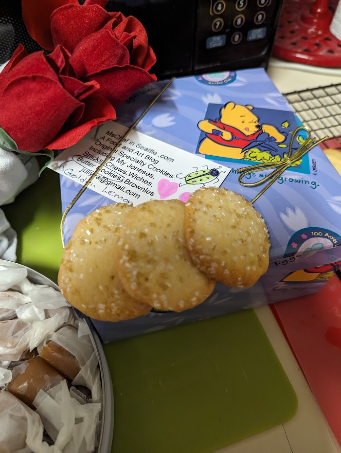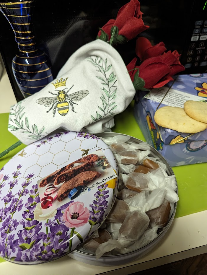 My Honey Rose Caramels (which didn’t capture the rose flavor because honey won the battle for first place) and the Lemon Butter Cookies went on a trip to a ranch and a special birthday girl who trains rescue dogs, is a beekeeper and a very busy mother and wife. I even found a tin appropriate for the wrapped caramels. See the honey bees amongst the lilacs?