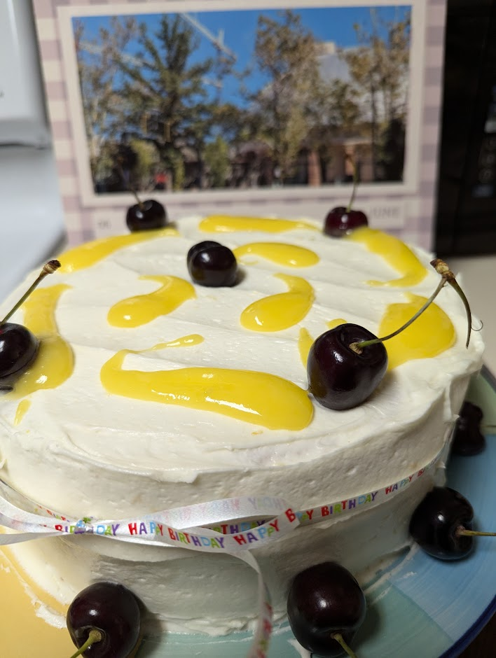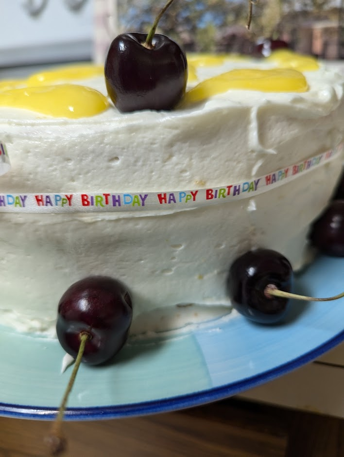 The resident lady who hobby is our flower gardens has a birthday today. She likes lemon cake so I made a 3-layer lemon cake, fresh lemon curd and lemon cream cheese frosting. I couldn’t help myself, though. I had to decorate with Washington cherries from Rainier Fruit.