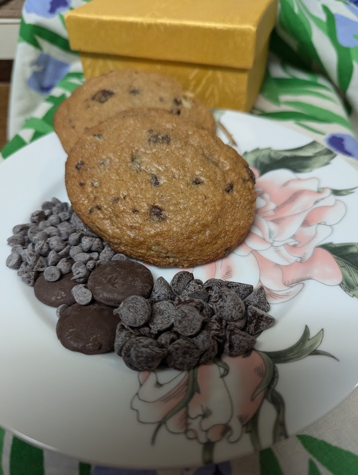 However, in light of the fact that I began a new round of physical therapy today and almost always bake a batch of gratitude cookies to take to the team at the University of Washington medical campus near me, I decided to follow the recipe precisely as it is since chocolate chip is my therapist’s favorite. This cookie met every expectation I have for a crunchy-around-the-edge but soft and full of flavor and chocolate-y cookie. It’s made with browned butter, a tangzhong* and both chopped and chip versions of semisweet chocolate. (I used organic minis and regular-sized chips with no wax coating and chopped Ghirardelli disks.)