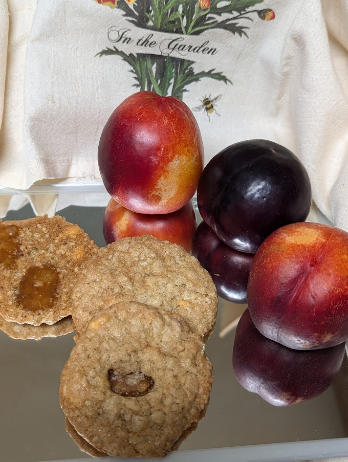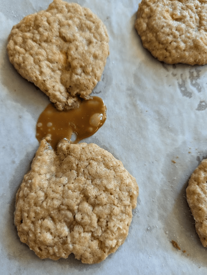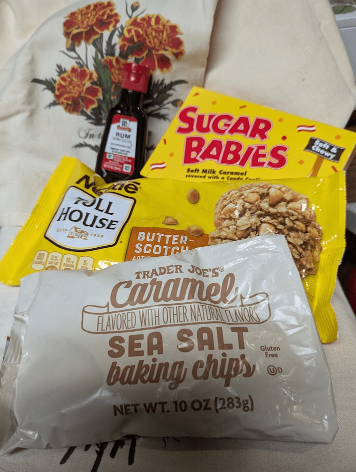 Take the recipe on the package of Nestle’s Butterscotch chips, cut the cinnamon in half, reserve 1/2 cup of the butterscotch chips for another use, add 1/2 cup Trader Joe’s Caramel Sea Salt baking chips and 1/2 cup Sugar Babies, make dough balls the size of small walnuts and pat them down to about 1/4″ and bake at 350 degrees F. for 8 minutes, cool on the parchment for 5 minutes and remove to wire rack. A couple of them will have a bit of bust-out by the Sugar Babies. Mmm.