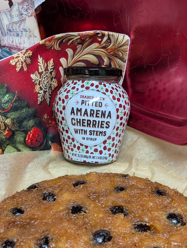The classic is pretty, but the thing is: there’s red dye in those Maraschinos. The second thing is: Trader Joe’s brings out Amarena cherries in the holiday season and they’re not dyed. They’re also supremely delicious and I fulfilled my dream of putting them on the top of some caramel and crushed pineapple. I will never go back. True, they’re not red. They’re dark purple. The flavor mix is Mschef’s kiss.