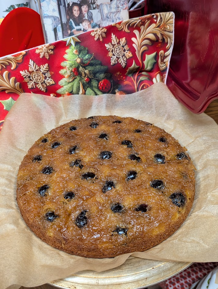 Most Americans who make pineapple upside-down cake use Maraschino cherries (if they use cherries to decorate this type of cake) in the middle of canned pineapple rings (or tidbits or crushed pineapple) over the butter and brown sugar in the bottom of the cake pan. For example, see this post* of a birthday cake I made using that combination, and this pic is of a roundie I made for my birthday in September. My Amarena dreams weren’t in the store yet.