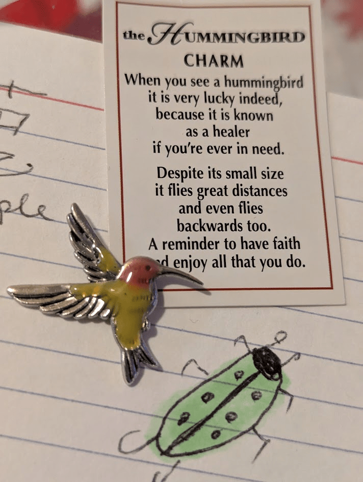 I love hummingbirds. A few years ago there was one of the species commonly known as Anna’s who seemed to follow me around, fly back and forth in front of my living room window, especially when I had my guitar on my lap and was singing and strumming. I could hear the bird’s tik-tik-tik whenever she was nearby and so I named her TikTik. My daughter, Maria, knowing I had a love for the bird, gave me the tiny Anna’s hummingbird charm.