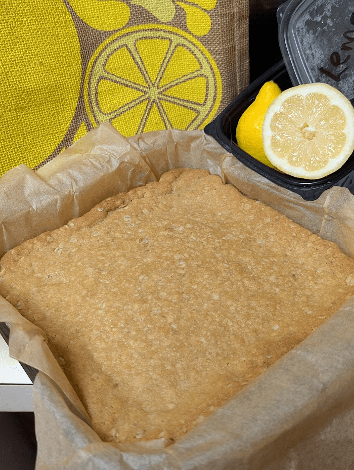 The filling, which is merely 1/2 cup fresh lemon juice and zest of the lemon stirred together with the sweetened condensed milk until it thickens, is poured and spread over the bottom layer BEFORE it is baked. (Other recipes require partial baking of the bottom layer.) Then cut a piece of waxed paper, mark the pan edges with a gentle knife, put the other half of the dough on it and pat it to the marked edge of the waxed paper. Then pick up the wax paper and flip the flattened dough over the top of the filling, carefully removing the wax paper so as not to tear the dough. (Other recipes do not require such precision. I’m a perfectionist.)