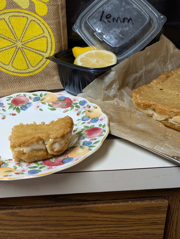The filling, which is merely 1/2 cup fresh lemon juice and zest of the lemon stirred together with the sweetened condensed milk until it thickens, is poured and spread over the bottom layer BEFORE it is baked. (Other recipes require partial baking of the bottom layer.) Then cut a piece of waxed paper, mark the pan edges with a gentle knife, put the other half of the dough on it and pat it to the marked edge of the waxed paper. Then pick up the wax paper and flip the flattened dough over the top of the filling, carefully removing the wax paper so as not to tear the dough. (Other recipes do not require such precision. I’m a perfectionist.)
