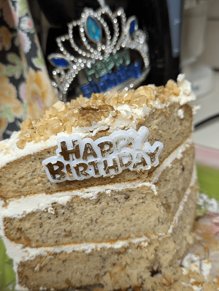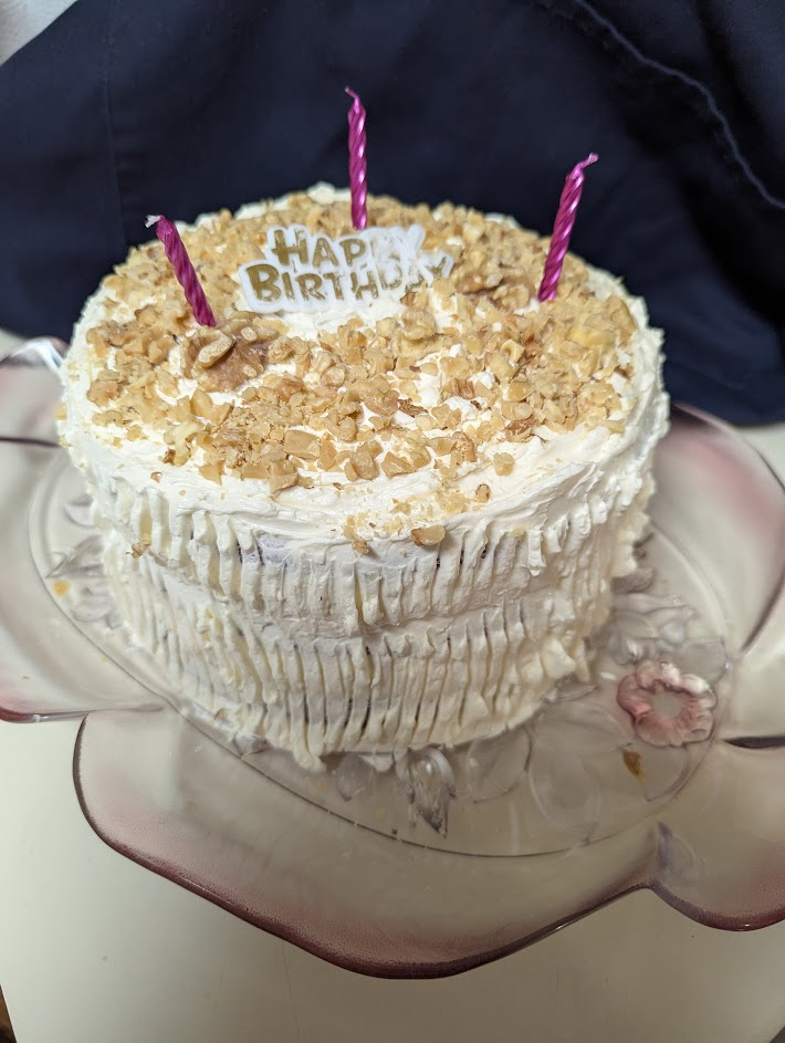 While today, the 14th of September, is my birthday, I baked this delicious Banana Cake with Toasted Walnuts and Ermine frosting to celebrate the birthdays of two other women as well as myself, all of us within a few days of the other. We’re also all participants in Music Night and I like to celebrate the birthdays of my fellow singers and musicians when we gather on Saturday nights. And so it was and so it will be the next time one of us has a birthday.