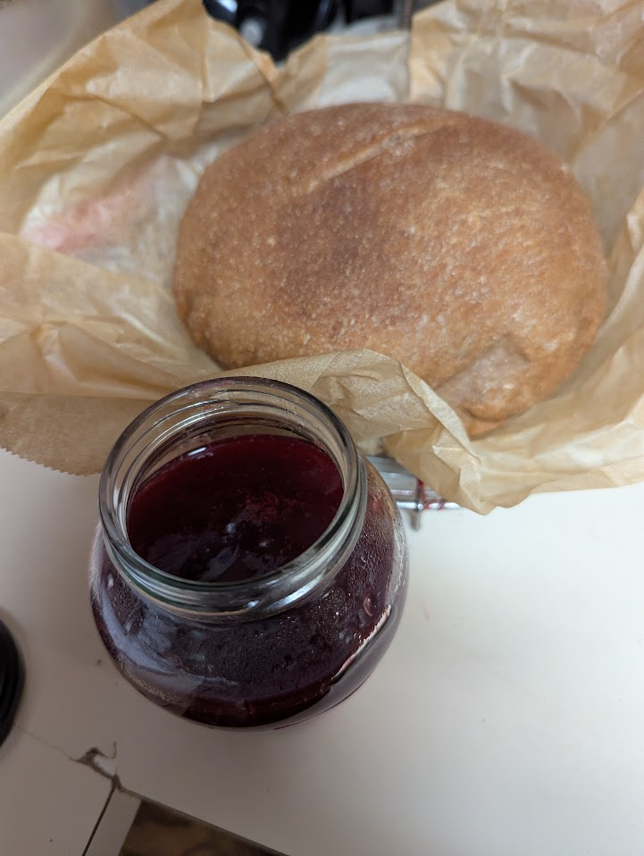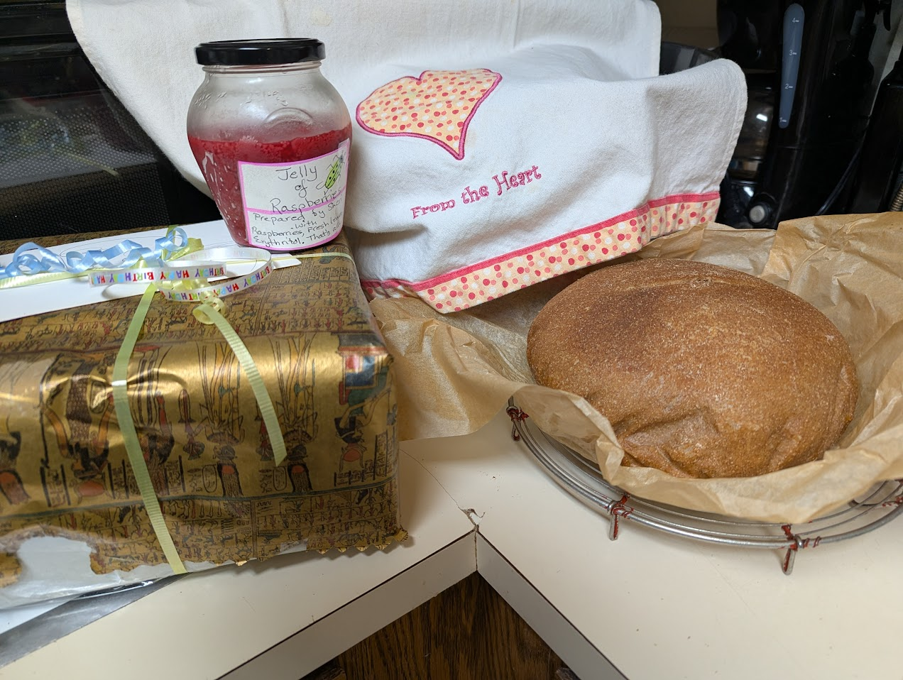 Well, the new computer is installed, the external hard drives are connected and I’m off and running. Meanwhile I baked a beautiful loaf of whole wheat Quarantine Bread and made a small jar of seedless fresh raspberry jelly/syrup with Erythritol for my tech neighbor. Last night I inflated balloons and put them along with a Happy Birthday sign next to the computer he uses in the Community Room here, so his day will be full of nice surprises.